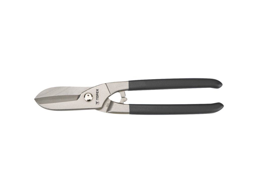 Nůžky na kov TOPEX (č. 01A440) o délce 250 mm jsou určeny ke stříhání plechů o tloušťce do 1,2 mm. Hlava je vyrobena z legované oceli. Díky gumovým překryvům na rukojeti výrobek pevně padne do ruky a neklouže. Ostré hrany čelistí snadno a hladce řežou plech. Vyrobeno v souladu s normou DIN 6438. Značka TOPEX je určena pro kutily.Doplňkové parametry
