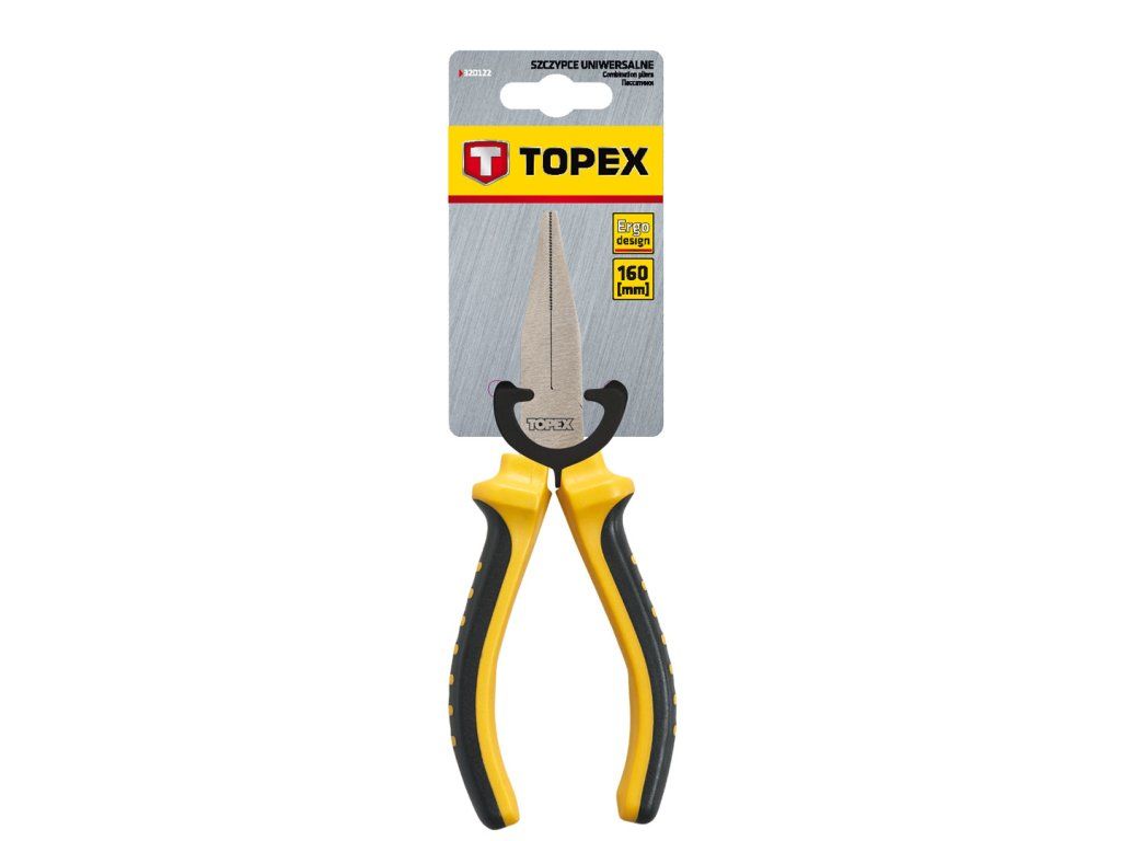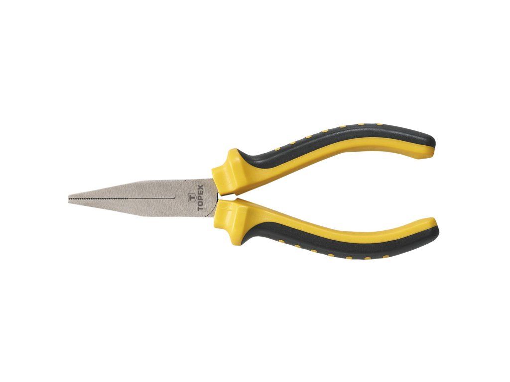 Ploché kleště TOPEX (ref. 32D108) o délce 160 mm. Vyrobeno z kalené oceli, navíc s indukčně kalenými řeznými plochami. Ergonomické rukojeti pokryté protiskluzovým materiálem zajišťují pohodlí a bezpečnost při práci. Výrobek se dokonale přizpůsobí tvaru ruky. Značka TOPEX je určena pro kutily.Doplňkové parametry