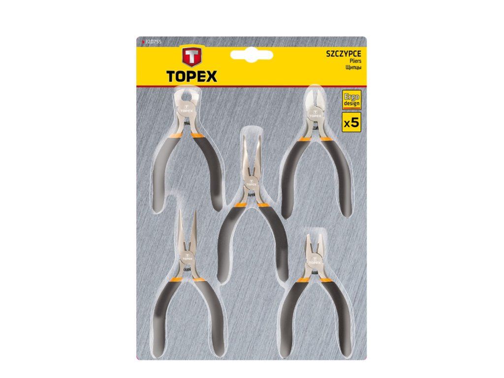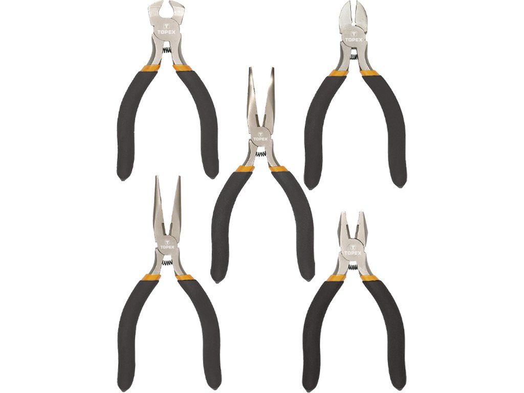 Sada přesných kleští TOPEX (č. 32D755) obsahuje pět nejuniverzálnějších kleští. Každý z nich je vyroben z kalené oceli, řezné plochy jsou navíc indukčně kalené. Ergonomické rukojeti pokryté protiskluzovým materiálem zajišťují pohodlí a bezpečnost při práci. Výrobek perfektně padne do ruky. Značka TOPEX je určena pro kutily.Doplňkové parametry