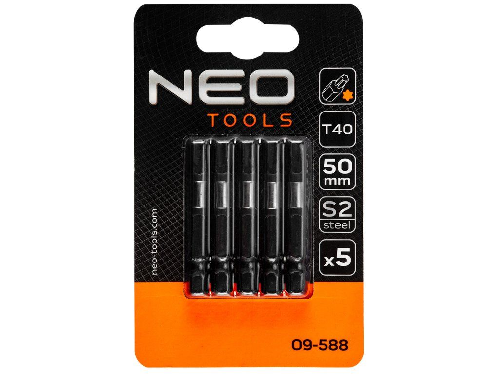Rázové bity NEO (č. v. 09-588) je sada 5 profesionálních rázových bitů typu T40 o délce 50 mm. Jsou určeny pro šroubováky 1/4". Mají systém ochrany proti vyklouznutí čepele ze šroubu. Bity jsou vyrobeny z oceli S2. Lze dosáhnout vysokého utahovacího momentu 21,8 Nm. Systém absorpce krouticího momentu chrání bity před rychlým opotřebením a výrazně prodlužuje jejich životnost.Doplňkové parametry