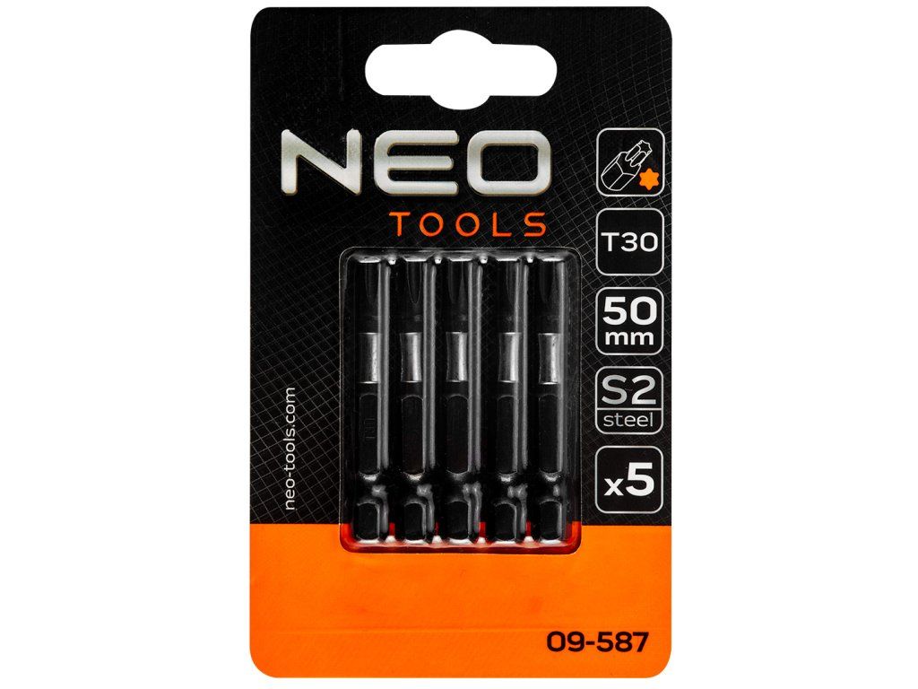 Rázové bity NEO (č. v. 09-587) je sada 5 profesionálních rázových bitů typu T30 o délce 50 mm. Jsou určeny pro šroubováky 1/4". Mají systém ochrany proti vyklouznutí čepele ze šroubu. Bity jsou vyrobeny z oceli S2. Lze dosáhnout vysokého utahovacího momentu 21,8 Nm. Systém tlumení krouticího momentu chrání bity před rychlým opotřebením a výrazně prodlužuje jejich životnost.Doplňkové parametry