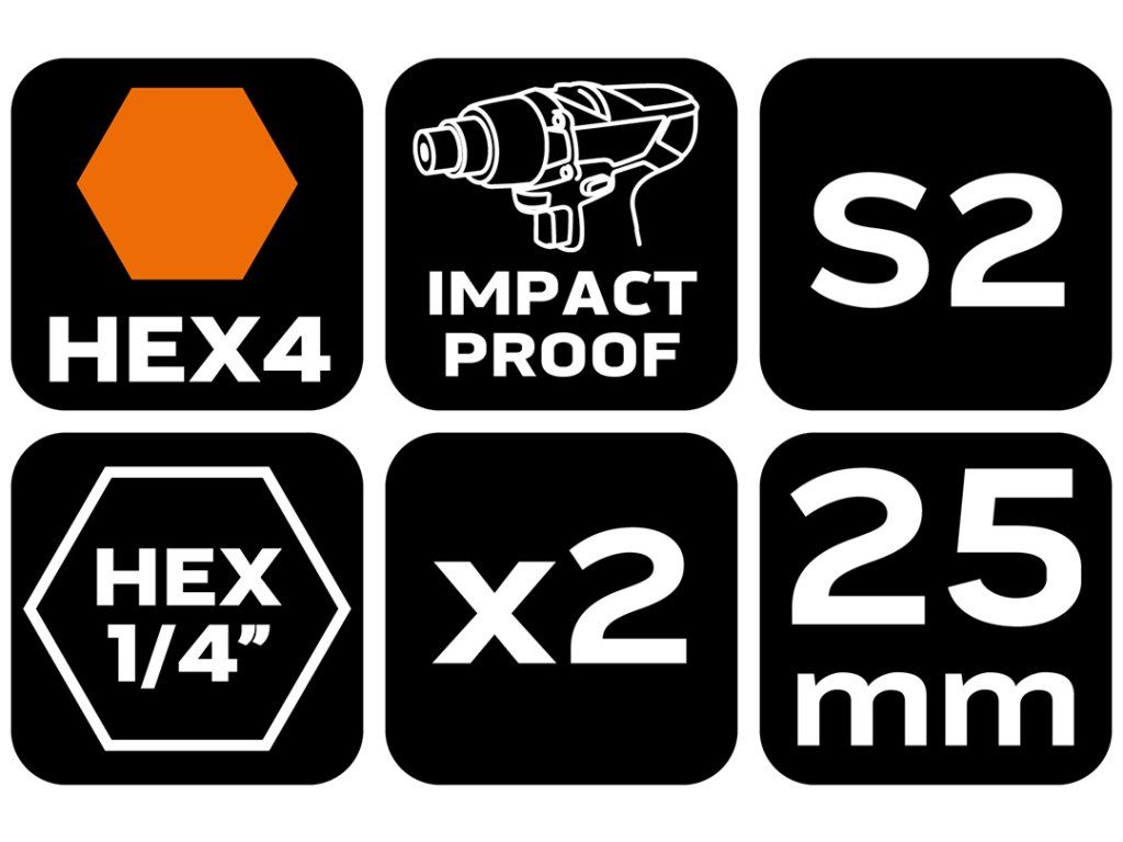NEO TOOLS Rázové bity HEX4 x 25 mm, 2 ks.