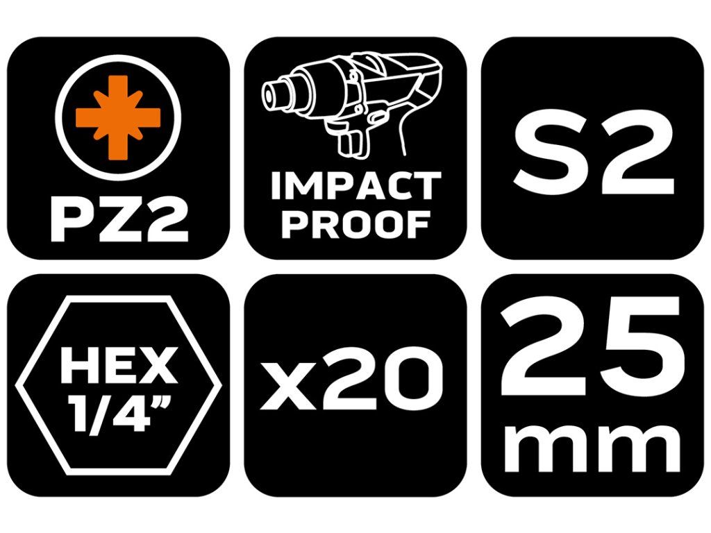 NEO TOOLS Rázové bity PZ2 x 25 mm, 20 ks.