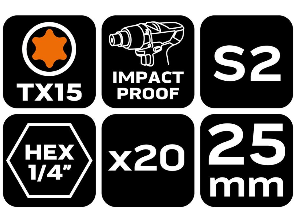 NEO TOOLS Rázové bity TX15 x 25 mm, 20 ks. 2. V