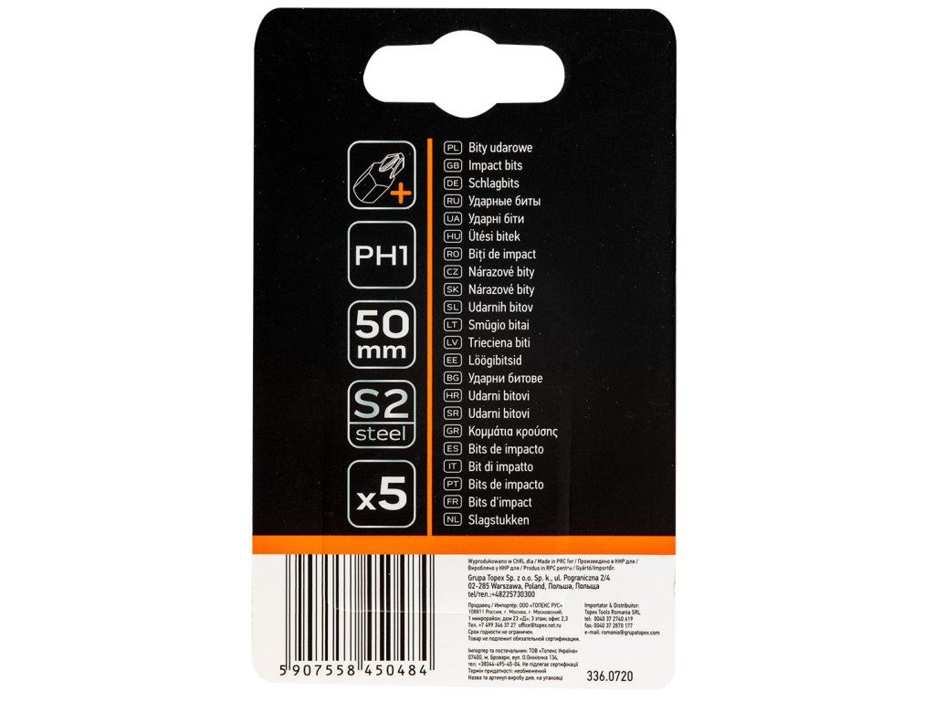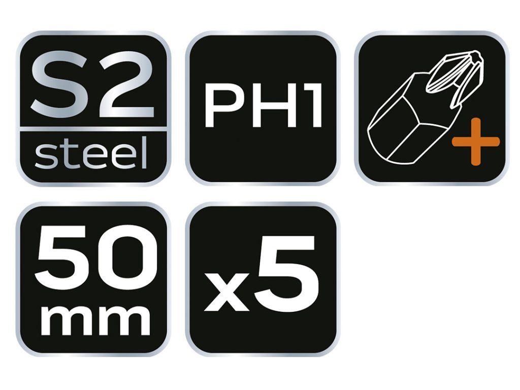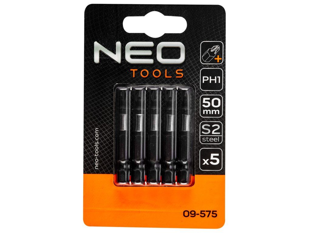 Rázové bity NEO (č. v. 09-575) je sada 5 profesionálních rázových bitů typu PH1 o délce 50 mm. Jsou určeny pro šroubováky 1/4". Mají systém ochrany proti vyklouznutí čepele ze šroubu. Bity jsou vyrobeny z oceli S2. Lze dosáhnout vysokého utahovacího momentu 21,8 Nm. Systém tlumení krouticího momentu chrání bity před rychlým opotřebením a výrazně prodlužuje jejich životnost.Doplňkové parametry