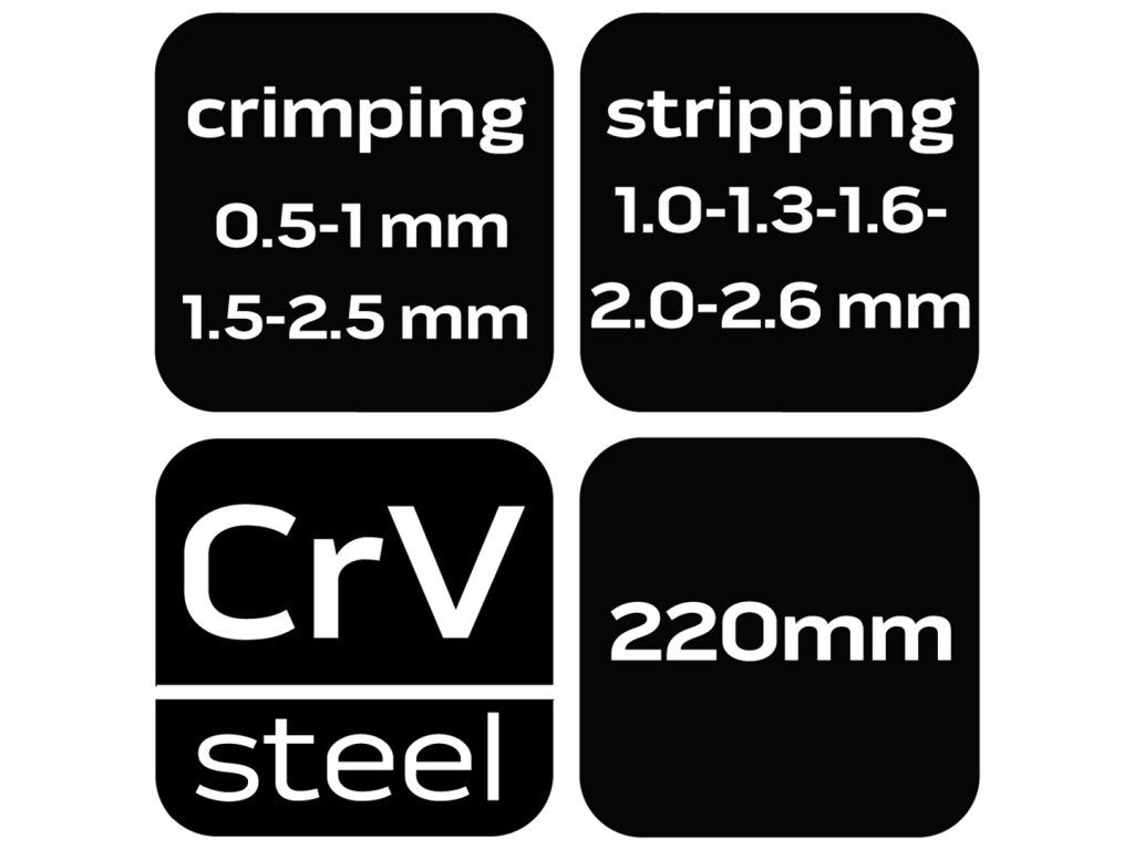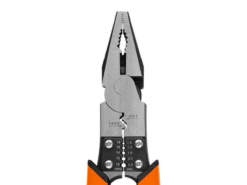 Multifunkční univerzální kleště 01-246 od společnosti NEO TOOLS jsou nástrojem určeným k držení součástek a odstraňování izolace z vodičů. Jsou vyrobeny z chrom-vanadiové oceli CRV a zajišťují trvanlivost a odolnost proti opotřebení při každodenní práci. Leštěná hlava usnadňuje přesnou manipulaci s nástrojem. Kleště NEO TOOLS jsou vybaveny funkcí krimpování v rozmezí 0,5-1 mm a 1,5-2,5 mm, jakož i přídavnými odizolovacími kleštěmi pro vodiče o velikosti 1,0/1,3/1,6/2,0/2,6 mm. Multifunkční konstrukce umožňuje provádět několik základních operací jedním nástrojem, takže kleště jsou vhodné pro elektrikáře a mechaniky.Doplňkové parametry