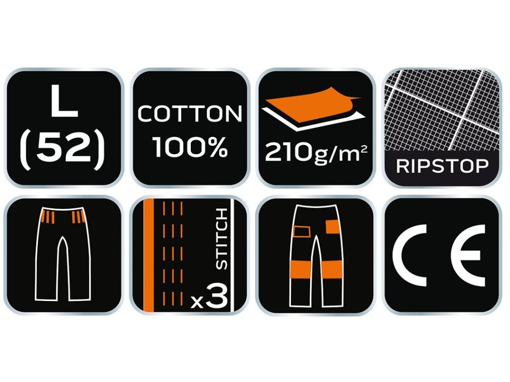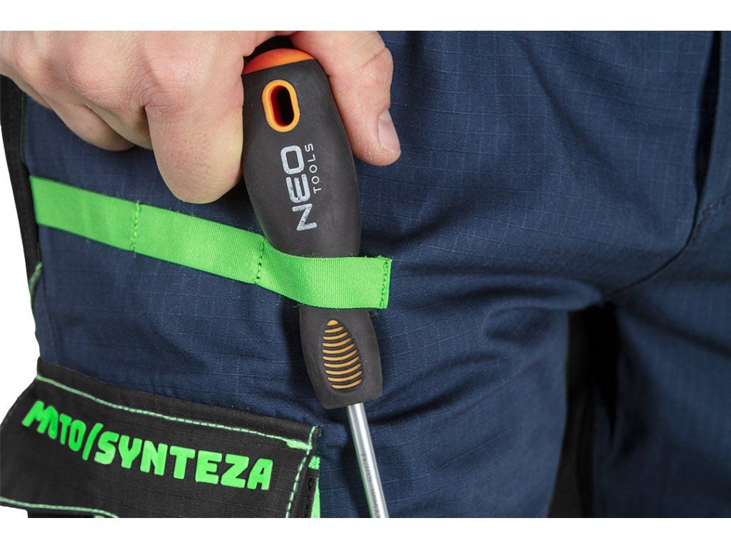 Pracovní kalhoty Motosynthesis, 100% ripstop bavlna, velikost L 81-235-L od firmy NEO, vyrobené ze 100% ripstop bavlny s gramáží 210 g/m2 - vyznačují se zvýšenou odolností proti roztržení a jsou zesíleny tkaninou oxford 100% polyester s gramáží 220 g/m2. Prostorné kapsy na zip, stejně jako další kapsa na zip na stehně nebo kapsy na kolenních chráničích, zvyšují možnosti kalhot. Jsou také vybaveny držákem na nářadí a zadními kapsami na zip ukrytými pod výztuhou, takže nabízejí mnoho úložných možností. Další snadný přístup ke kapsám a háčkům umožňuje efektivní vytahování potřebného příslušenství. Kalhoty mají v pase elastické vsadky pro snadné nastavení velikosti. Vnitřní strana nohavic je zpevněna tkaninou oxford a trojitým prošitím. Jmenovka usnadňuje personalizaci na pracovišti. Výrobek je certifikován CE. Kalhoty patří do řady Motosynteza, která vznikla ve spolupráci s Przemkem Szafranskim a je určena fanouškům motorismu.Doplňkové parametry