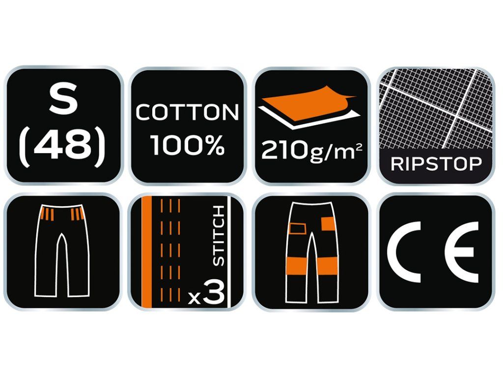 Pracovní kalhoty Motosynthesis, 100% ripstop bavlna, velikost S 81-235-S od firmy NEO ze 100% ripstop bavlny s gramáží 210 g/m2 - vyznačují se zvýšenou odolností proti roztržení a jsou zesíleny tkaninou oxford 100% polyester s gramáží 220 g/m2. Prostorné kapsy na zip, stejně jako další kapsa na zip na stehně nebo kapsy na kolenních vložkách, zvyšují možnosti kalhot. Jsou také vybaveny držákem na nářadí a zadními kapsami na zip ukrytými pod výztuhou, takže nabízejí mnoho úložných možností. Další snadný přístup ke kapsám a háčkům umožňuje efektivní vytahování potřebného příslušenství. Kalhoty mají v pase elastické vsadky pro snadné nastavení velikosti. Vnitřní strana nohavic je zpevněna tkaninou oxford a trojitým prošitím. Jmenovka usnadňuje personalizaci na pracovišti. Výrobek je certifikován CE. Kalhoty patří do řady Motosynteza, která vznikla ve spolupráci s Przemkem Szafranskim a je určena fanouškům motorismu.Doplňkové parametry
