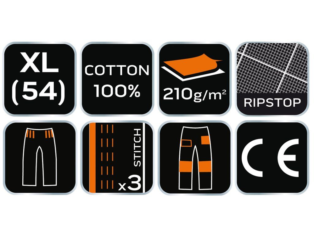 Pracovní kalhoty Neo Garage, 100% ripstop bavlna, velikost XL 81-237-XL od firmy NEO ze 100% ripstop bavlny s gramáží 210 g/m2 - vyznačují se zvýšenou odolností proti roztržení a jsou vyztužené tkaninou oxford 100% polyester s gramáží 220 g/m2. Prostorné kapsy na zip, stejně jako další kapsa na zip na stehně nebo kapsy na kolenních vložkách, zvyšují možnosti kalhot. Jsou také vybaveny držákem na nářadí a zadními kapsami na zip ukrytými pod výztuhou, takže nabízejí mnoho úložných možností. Další snadný přístup ke kapsám a háčkům umožňuje efektivní vytažení potřebného příslušenství. Kalhoty mají v pase elastické vsadky pro snadné nastavení velikosti. Vnitřní strana nohavic je zpevněna tkaninou oxford a trojitým prošitím. Jmenovka usnadňuje personalizaci na pracovišti. Výrobek je certifikován CE. Kalhoty jsou součástí řady Neo Garage určené pro fanoušky automobilů.Doplňkové parametry