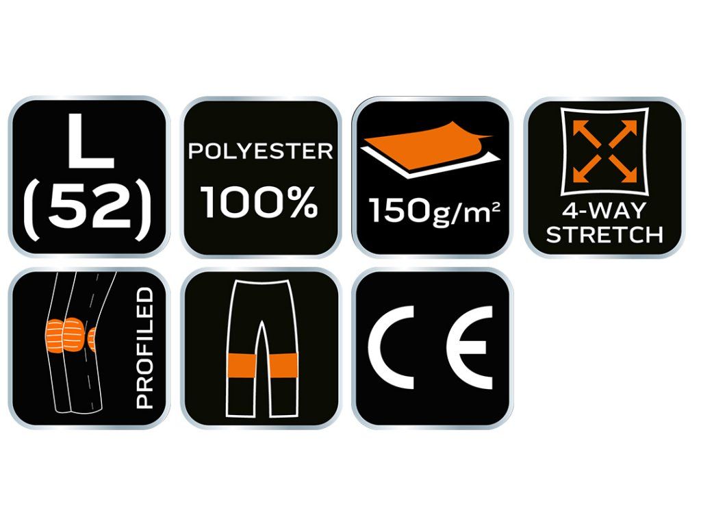 Pracovní kalhoty OUTDOOR, 4směrně strečové, honeboí, velikost L, 81-294-L od NEO TOOLS jsou kalhoty vyrobené ze 4směrně strečové tkaniny s,,bavlněnou keprovou vazbou na dotek". Vyznačují se složením ze 100% polyesteru rychleschnoucího a gramáží 150 g/m2. Kalhoty NEO TOOLS ve světle šedé barvě s tmavě šedými vsadkami v zadní části stehen a na kolenou jsou praktickou volbou pro mnoho příležitostí. Díky předním kapsám, prostorným kapsám na stehnech a zadní kapse pod légou na zip poskytují úložný prostor pro nezbytné doplňky. Elastický pas na bocích a obvod nohavic nastavitelný pomocí patentek zajišťují správné přizpůsobení konkrétním potřebám. Profilovaná kolena, jmenovka, široká poutka a štítek s logem na kolenou jsou výsledkem diskusí s odborníky, uživateli a dlouholetých zkušeností s výrobou pohodlných, víceúčelových pracovních oděvů.