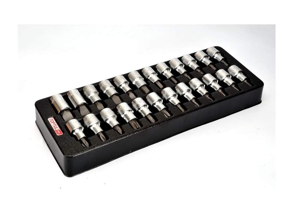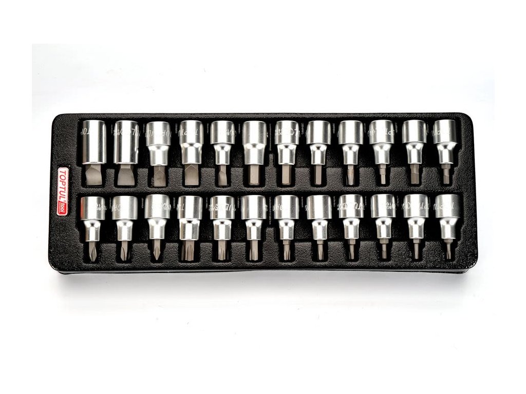 TOPTUL Sada nářadí - nástrčné bity, 1/2", 24 kusů 7 ks HEX:4,5,6,7,8,10,12mm, 5 ks ploché:8,10,12,14,16mm, 3 ks PH:PH2,3,4, 9 ks TORX: T20,T25,T27,T30,T40,T45,T50,T55,T60Doplňkové parametry