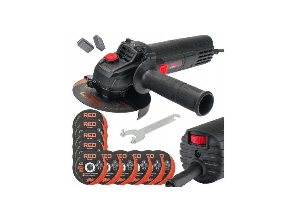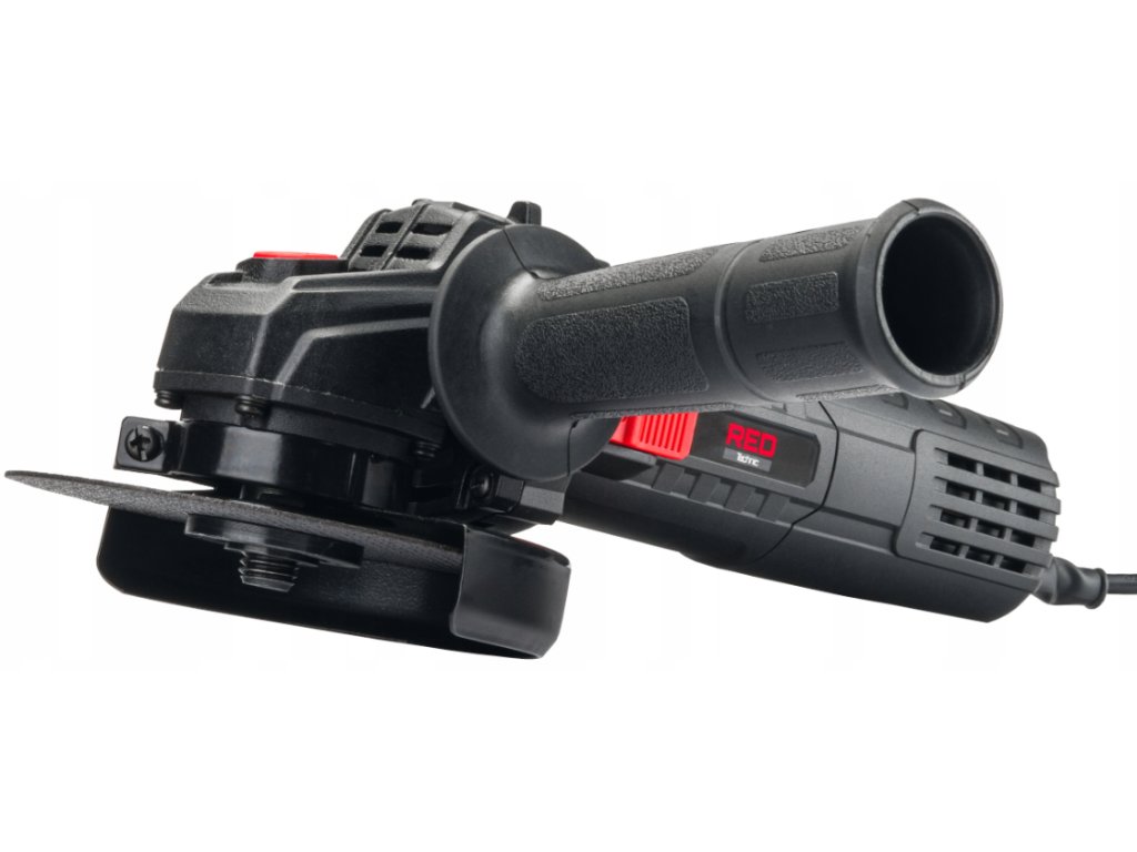 Úhlová bruska moderní značky RED TECHNIC určená pro řezání, broušení, čištění materiálů jako jsou: kov, dřevo, beton, plasty a mnoho dalších.