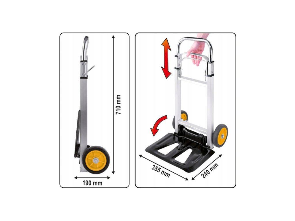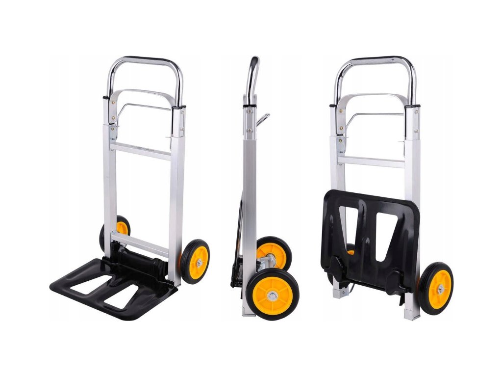 Skladový vozík je ideální pro převážení kartonů atp. Díky jedinečnému mechanizmu je složení či rozložení vozíku možné pomocí jediného pohybu. Teleskopický úchyt s uzamykacím systémem, který je v rozloženém stavu vysoký 1,08 metru, značně usnadňuje dopravu nákladu bez nadměrného úsilí.
