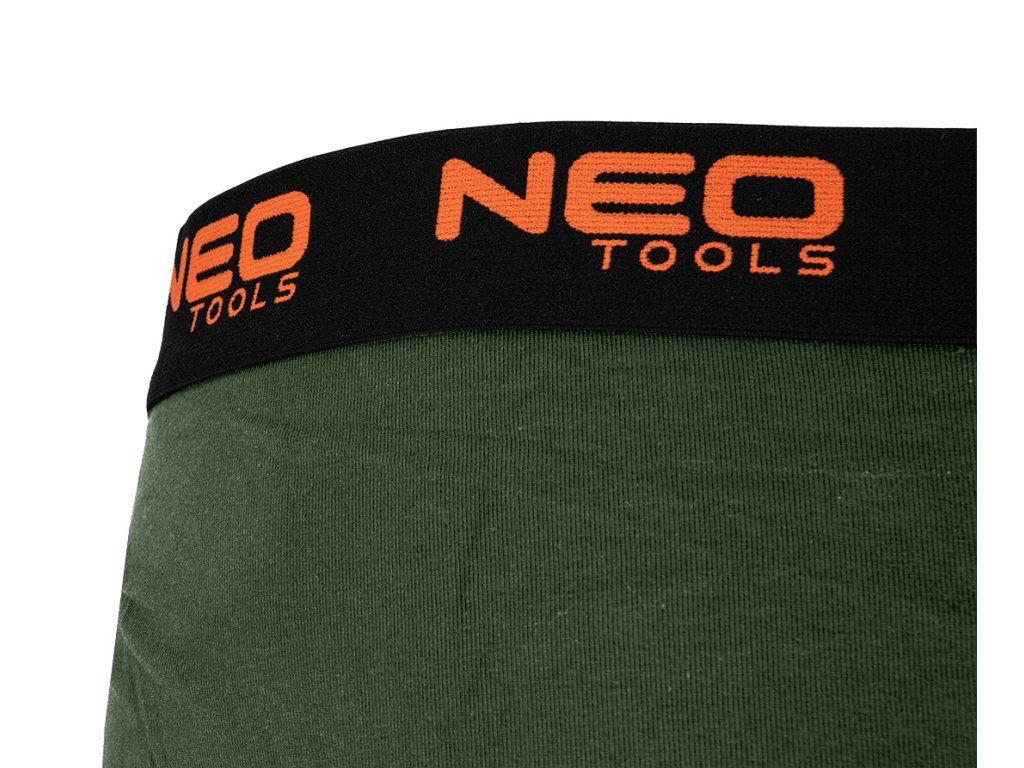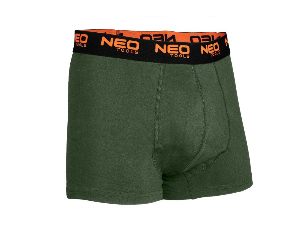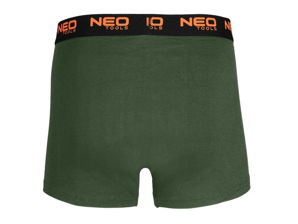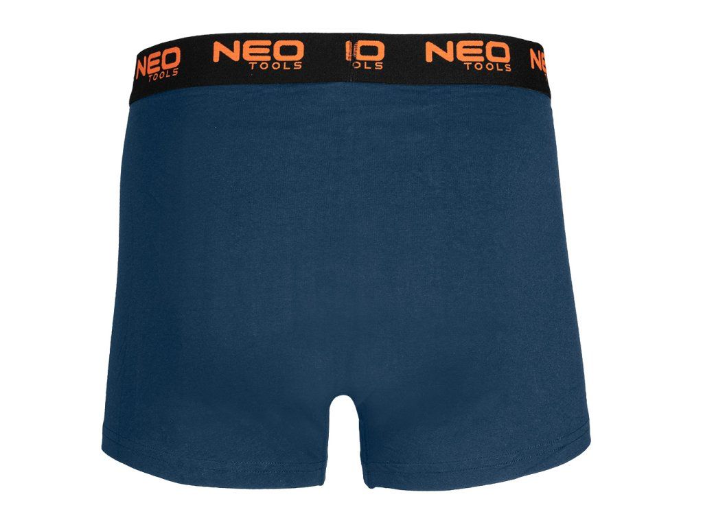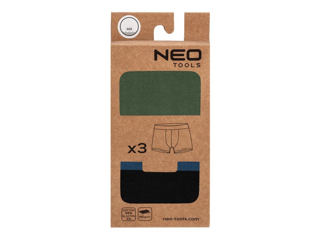 Boxerky Basic 2, 3-pack, velikost M, 81-678-M od NEO TOOLS je sada tří pánských boxerek ve třech barvách (hladké černé, hladké zelené, hladké tmavě modré). Vyrobeno z jednoduchého žerzeje z 95 % bavlny a 5 % elastanu. Vyznačují se gramáží 180 g/m2. Vybaveny měkkou žakárovou gumou s oranžovým logem. Má ploché přední panelové švy, další panel v rozkroku a žádné boční švy. K jejich pohodlí přispívají také hladce zakončené nohavice. Na vnitřní straně spodního prádla je vytištěn štítek s velikostí, složením a pokyny pro péči. Boxerky jsou baleny v kartonové krabici s okénkem. Oděv patří k vlastnímu designu značky NEO TOOLS. Doporučujeme jako originální dárek ke Dni mužů, Valentýnu nebo k jiné příležitosti.Doplňkové parametry