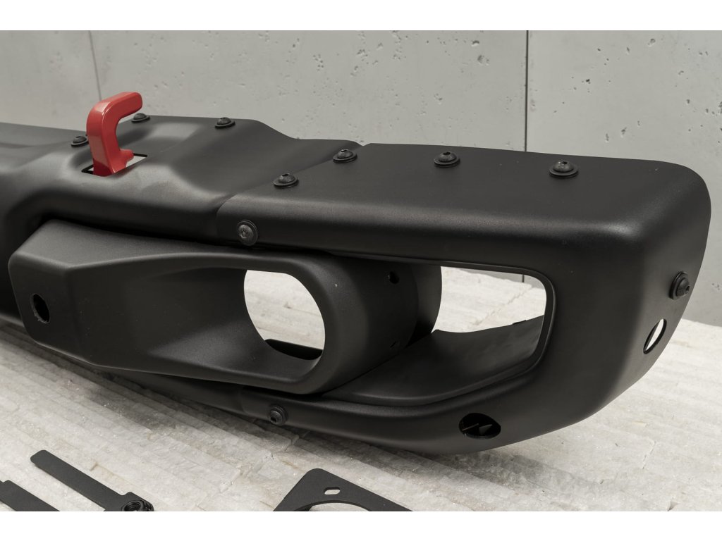 Robustní konstrukce, nekompromisní charakter a sportovní nádech - to jsou vlastnosti, kterými se Rubicon odlišuje. Nárazník inspirovaný svým designem umocňuje terénního ducha modelu Wrangler JL. Z hlediska praktičnosti se tento model vyrovná nejlepším terénním nárazníkům, přičemž si zachovává "civilní" vzhled. Kromě praktické funkce umožňuje nárazník RUBICON vytvořit působivý styling vozu Wrangler. Jedná se o modulární nárazník; boční ocelové díly lze odstranit a zvýšit tak světlou výšku a zlepšit úhel náběhu. Nárazník má montážní místo a desku pro elektrický naviják, červené tažné háky, výklopný držák registrační značky, kovové rámečky mlhových světel a přídavné držáky pracovních světel. Výrobek je vyroben z oceli válcované za studena, práškově lakované epoxidovým předlakem - díky takto pevnému nátěru vypadá nárazník dlouho skvěle. Součástka byla navržena tak, aby neomezovala chlazení motoru. |