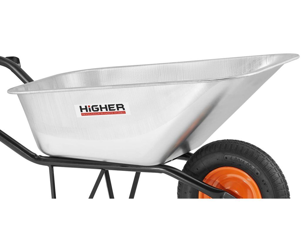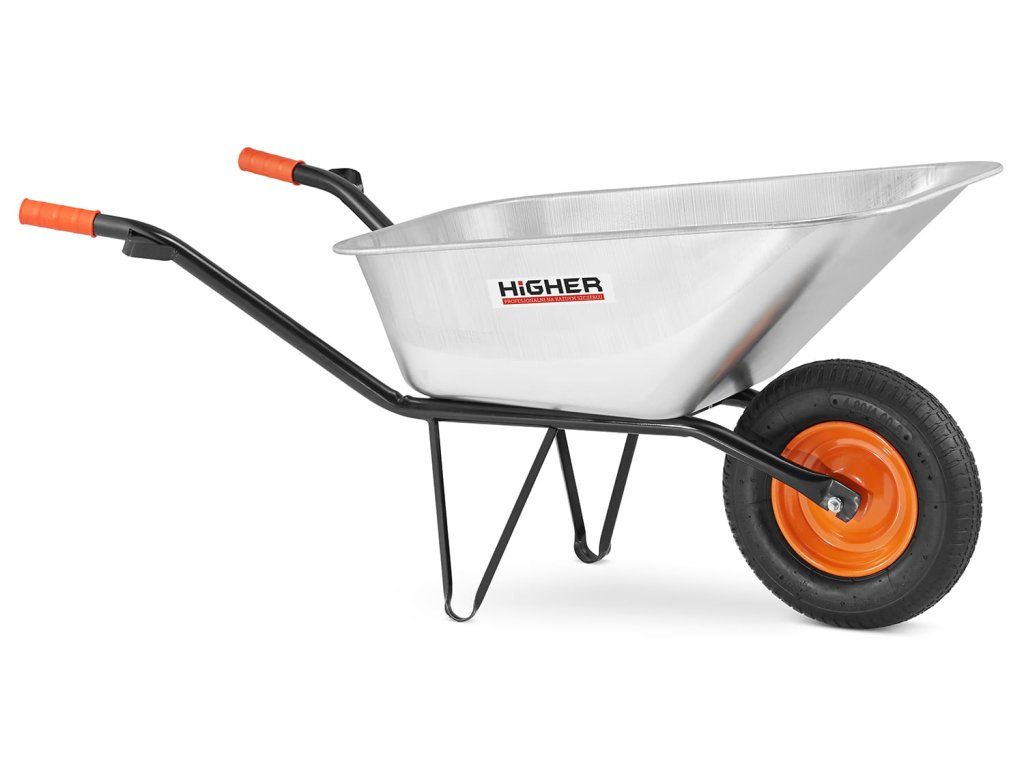 Pozinkovaný stavební trakař HIGHER s objemem 130 l a nosností 210 kg je spolehlivým pomocníkem pro práci na stavbě, zahradě i kolem domu. Odolná korba, pevný rám a pneumatické kolo usnadňují přepravu zeminy, písku, dřeva i suti.